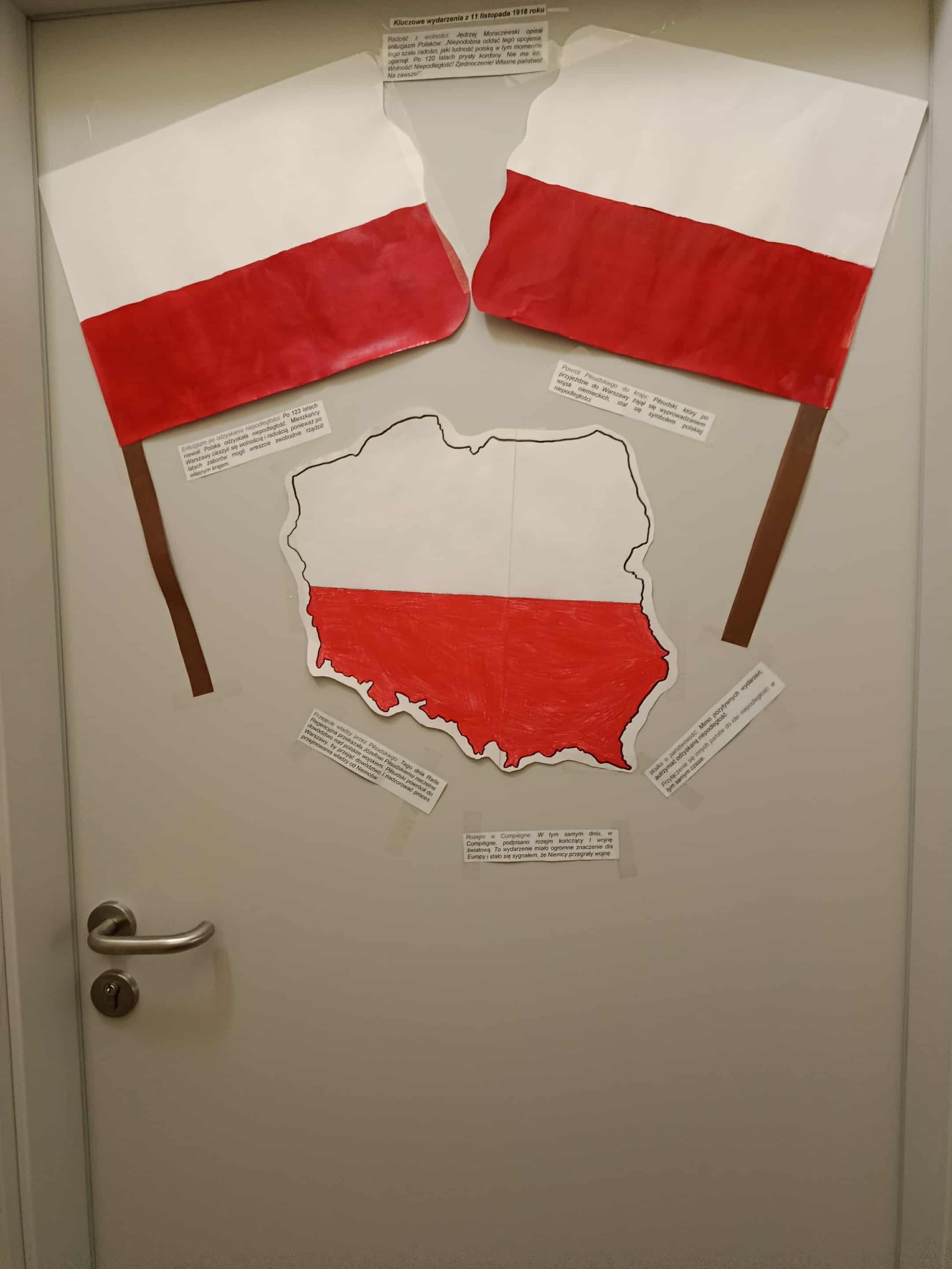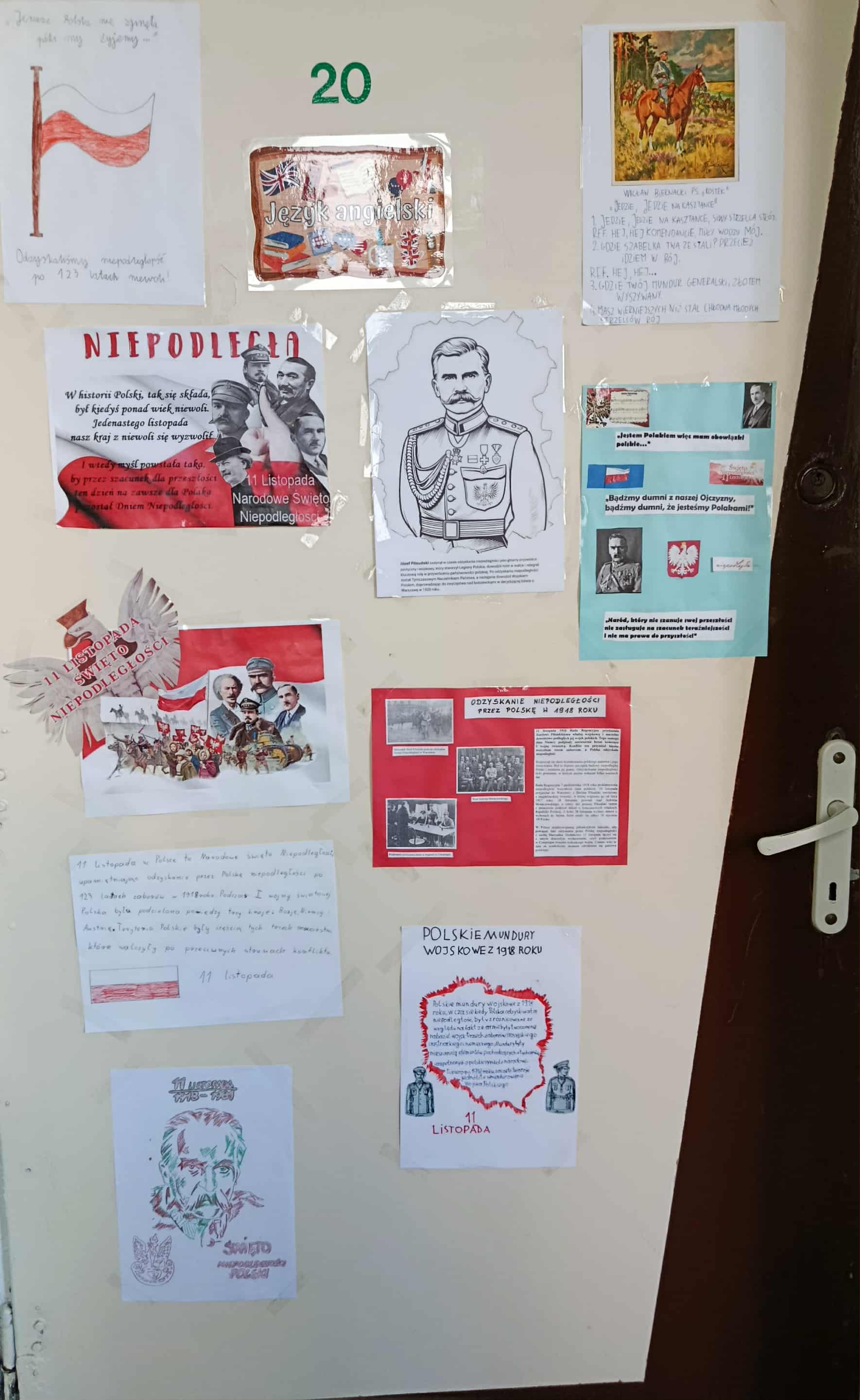 Obchody Narodowego Święta Niepodległości w tym roku rozpoczęliśmy od projektu „Drzwi do niepodległości”. Uczniowie klas od czwartych do ósmych mieli za zadanie ozdobić drzwi swojej sali barwami biało- czerwonymi i postaciami związanymi z odzyskaniem niepodległości. Efekty pracy przeszły najśmielsze oczekiwania.