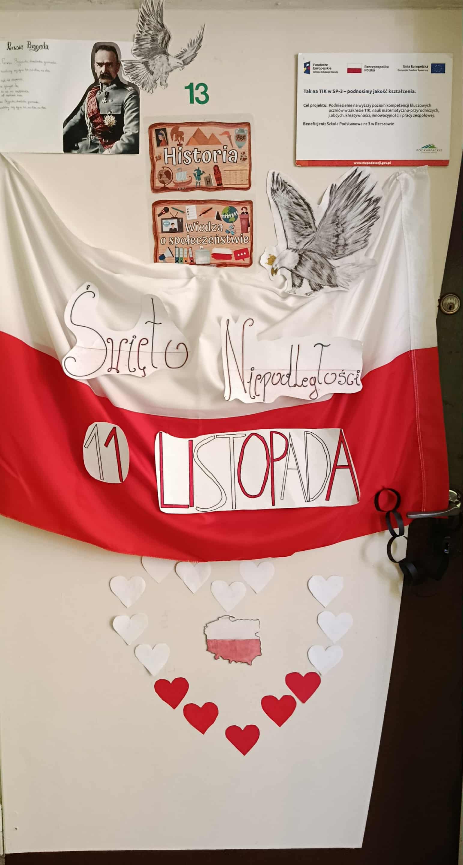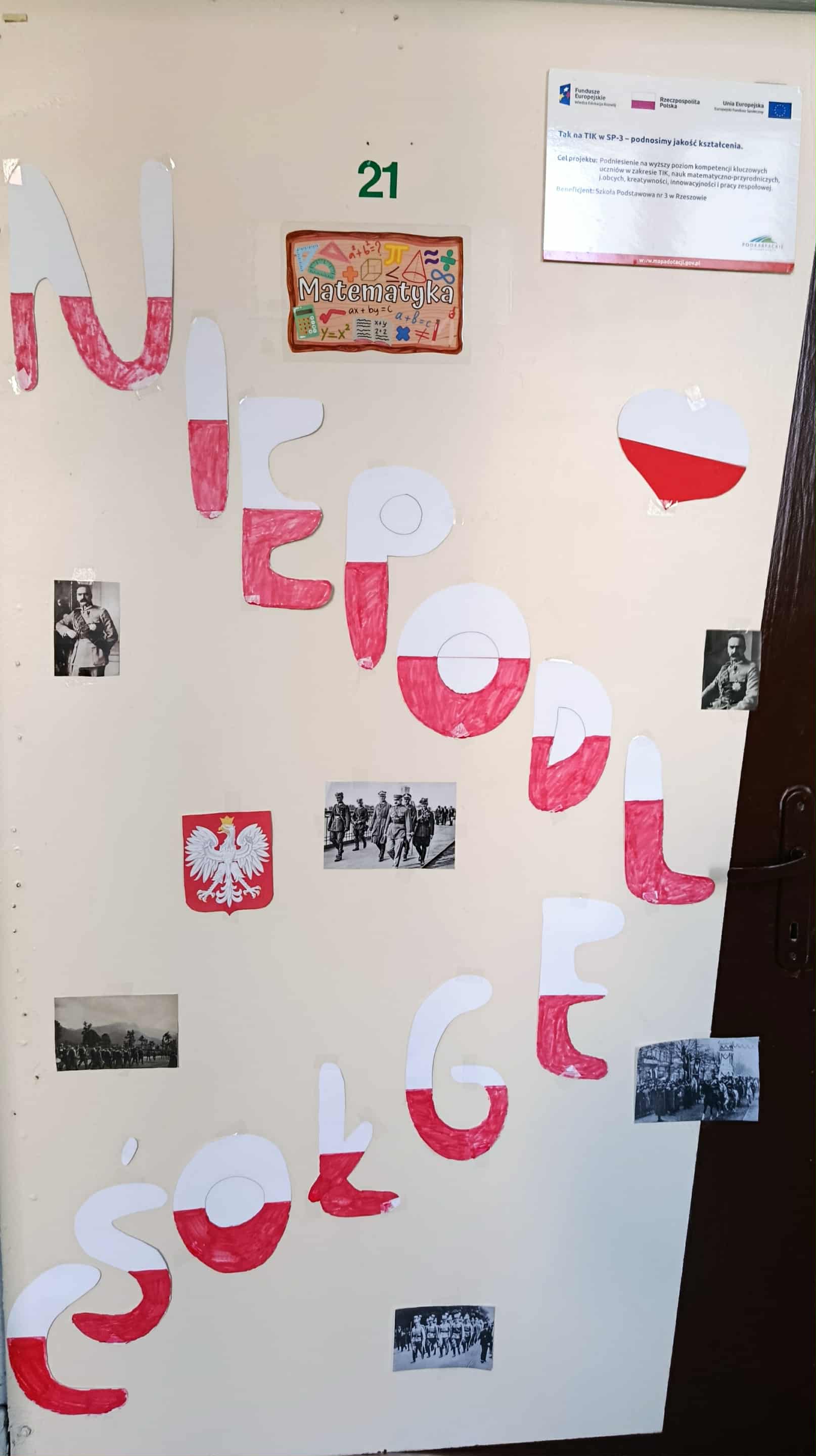 Obchody Narodowego Święta Niepodległości w tym roku rozpoczęliśmy od projektu „Drzwi do niepodległości”. Uczniowie klas od czwartych do ósmych mieli za zadanie ozdobić drzwi swojej sali barwami biało- czerwonymi i postaciami związanymi z odzyskaniem niepodległości. Efekty pracy przeszły najśmielsze oczekiwania.