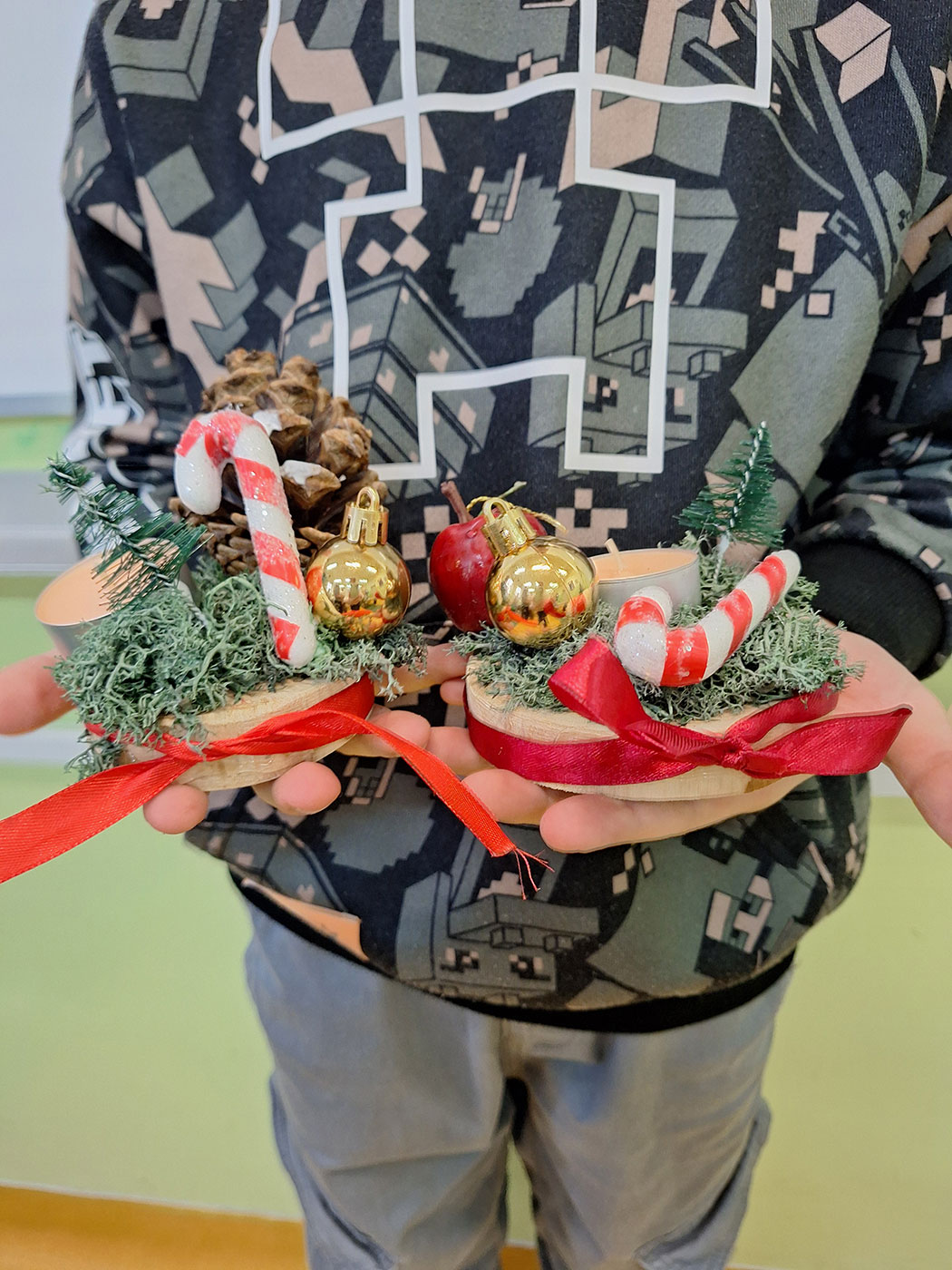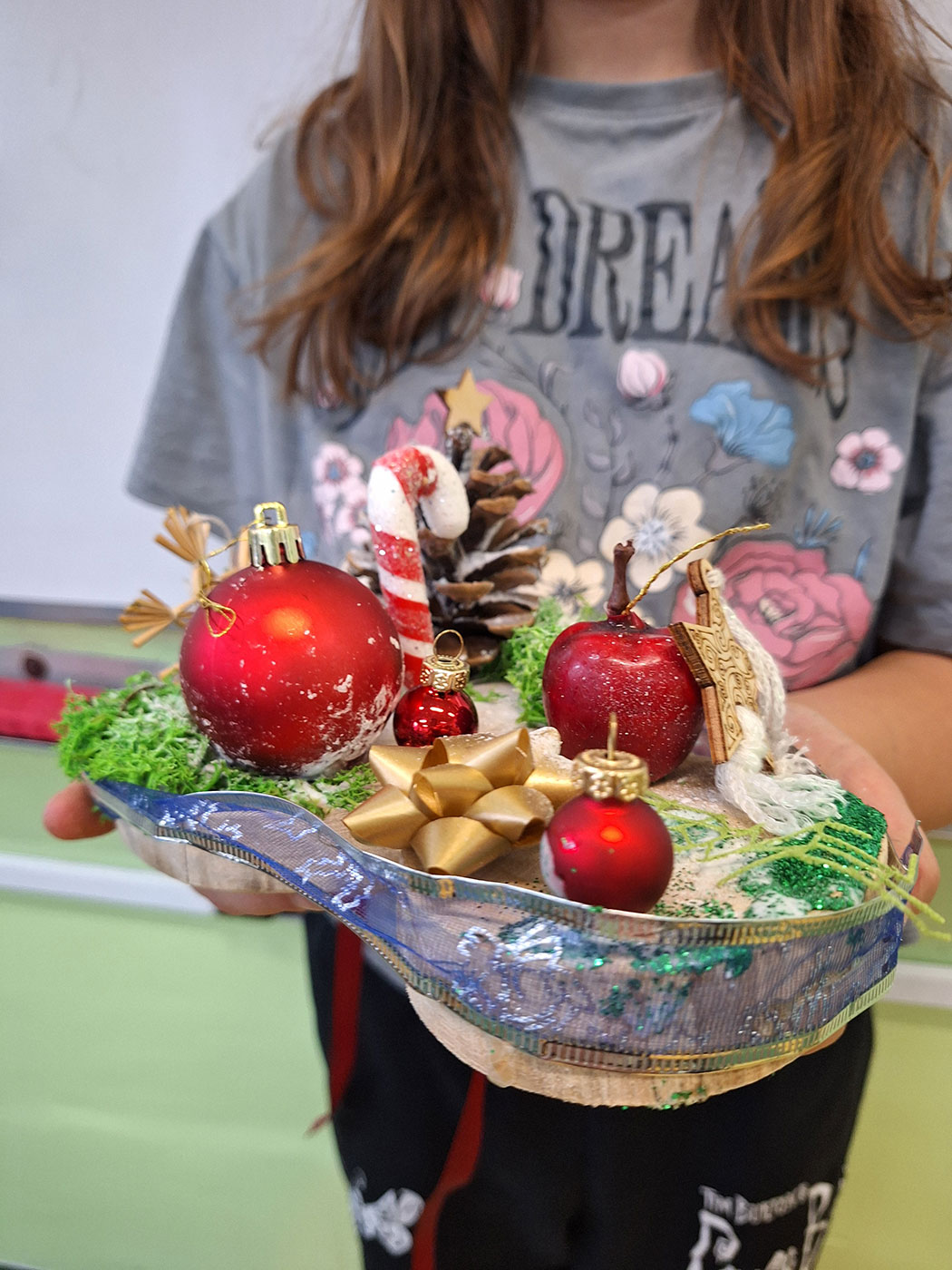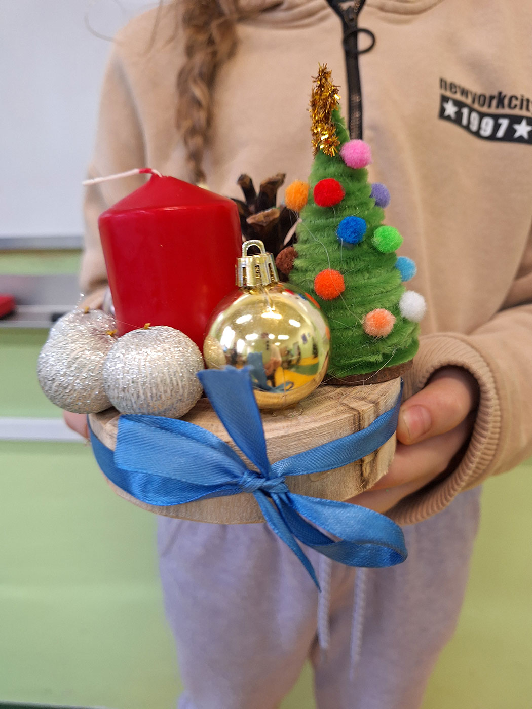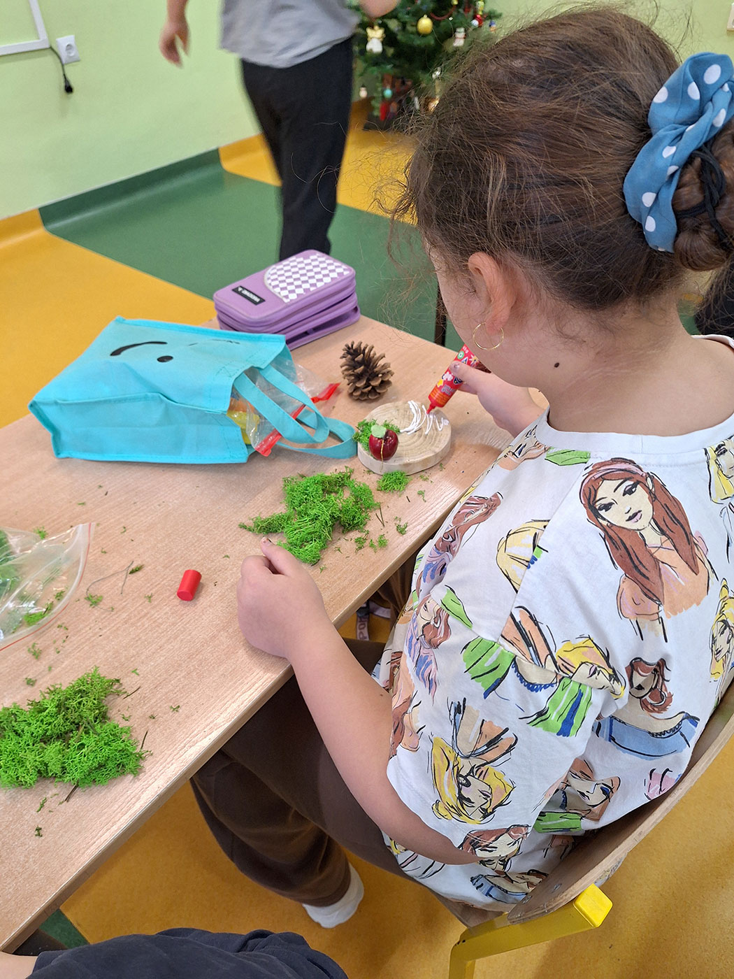 Podstawą ich prac były drewniane krążki, które stały się naturalnym i estetycznym podłożem do tworzenia świątecznych kompozycji. Dzieci z ogromnym zaangażowaniem i kreatywnością ozdabiały swoje stroiki gałązkami świerku, szyszkami, bombkami oraz kolorowymi wstążkami. Każda praca była niepowtarzalna i odzwierciedlała indywidualne pomysły uczniów, a w klasie zapanowała radosna, świąteczna atmosfera. Zajęcia stały się okazją do rozwijania zdolności manualnych, poznawania tradycji bożonarodzeniowych oraz wspólnej zabawy, która jeszcze bardziej zintegrowała uczniów. Powstałe stroiki wprowadziły do szkoły magię nadchodzących świąt i były pięknym dowodem na to, że własnoręcznie wykonane ozdoby mają szczególną wartość.