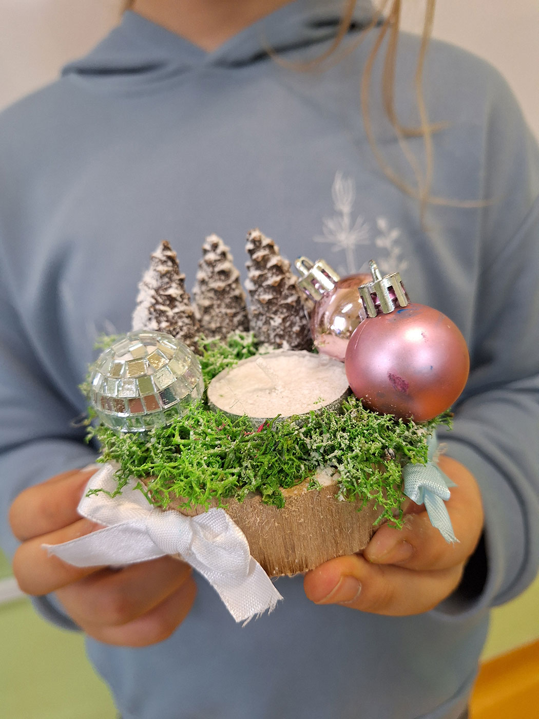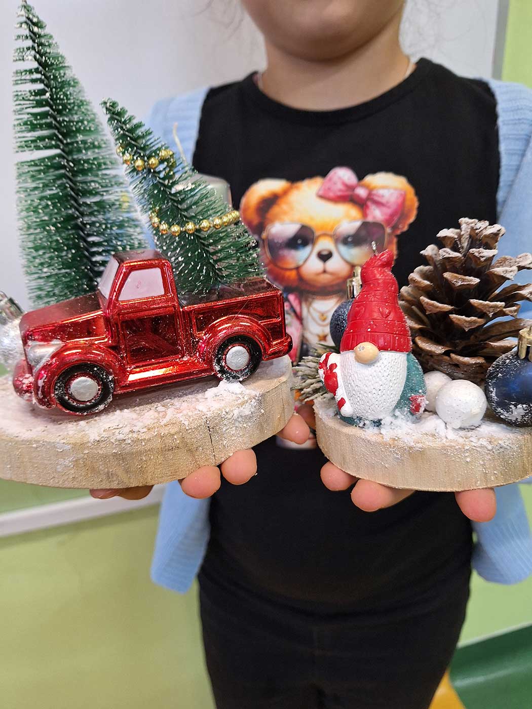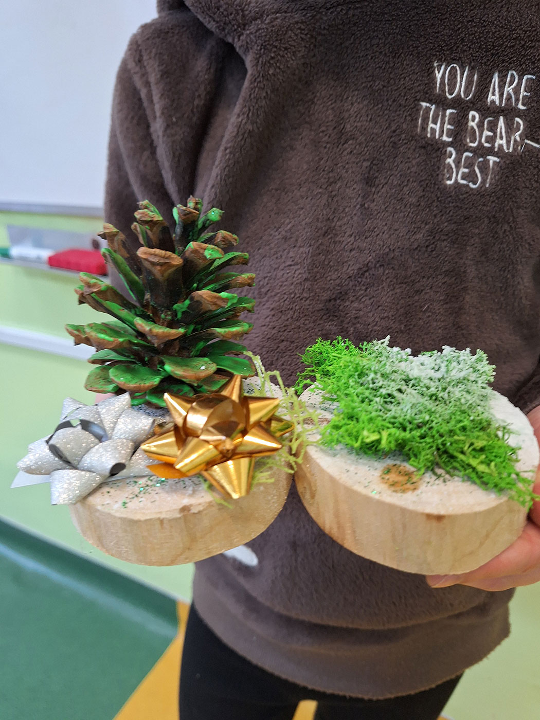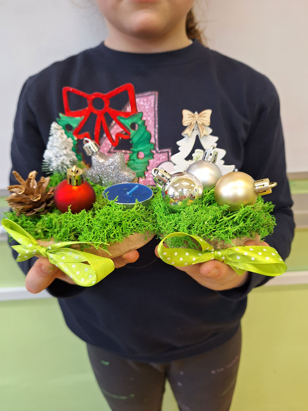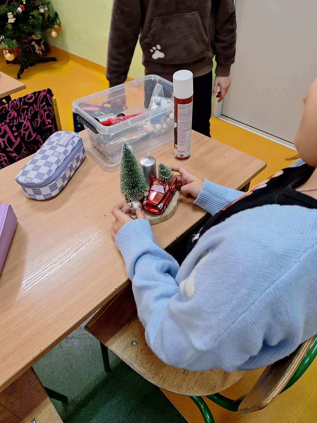 Podstawą ich prac były drewniane krążki, które stały się naturalnym i estetycznym podłożem do tworzenia świątecznych kompozycji. Dzieci z ogromnym zaangażowaniem i kreatywnością ozdabiały swoje stroiki gałązkami świerku, szyszkami, bombkami oraz kolorowymi wstążkami. Każda praca była niepowtarzalna i odzwierciedlała indywidualne pomysły uczniów, a w klasie zapanowała radosna, świąteczna atmosfera. Zajęcia stały się okazją do rozwijania zdolności manualnych, poznawania tradycji bożonarodzeniowych oraz wspólnej zabawy, która jeszcze bardziej zintegrowała uczniów. Powstałe stroiki wprowadziły do szkoły magię nadchodzących świąt i były pięknym dowodem na to, że własnoręcznie wykonane ozdoby mają szczególną wartość.