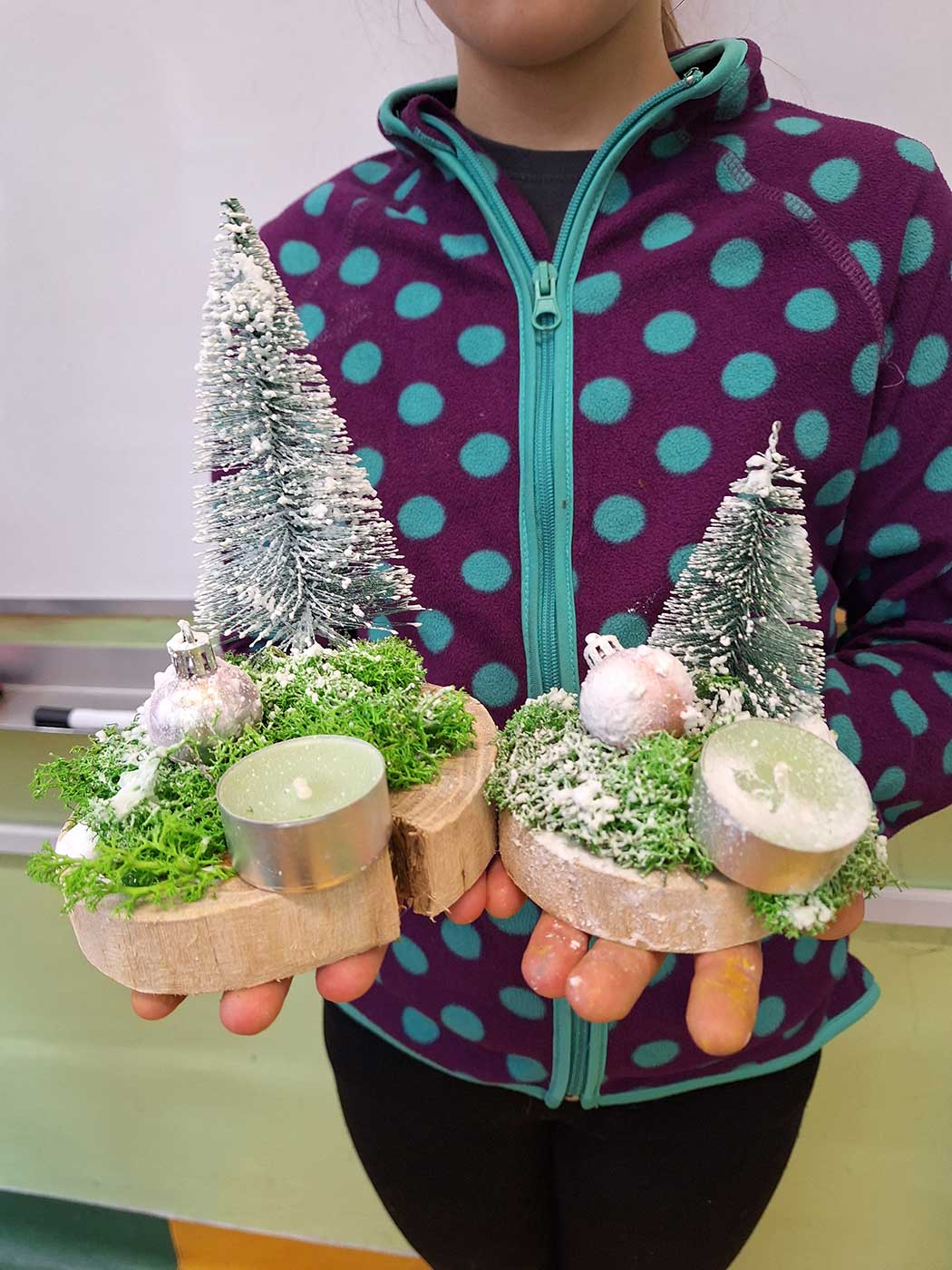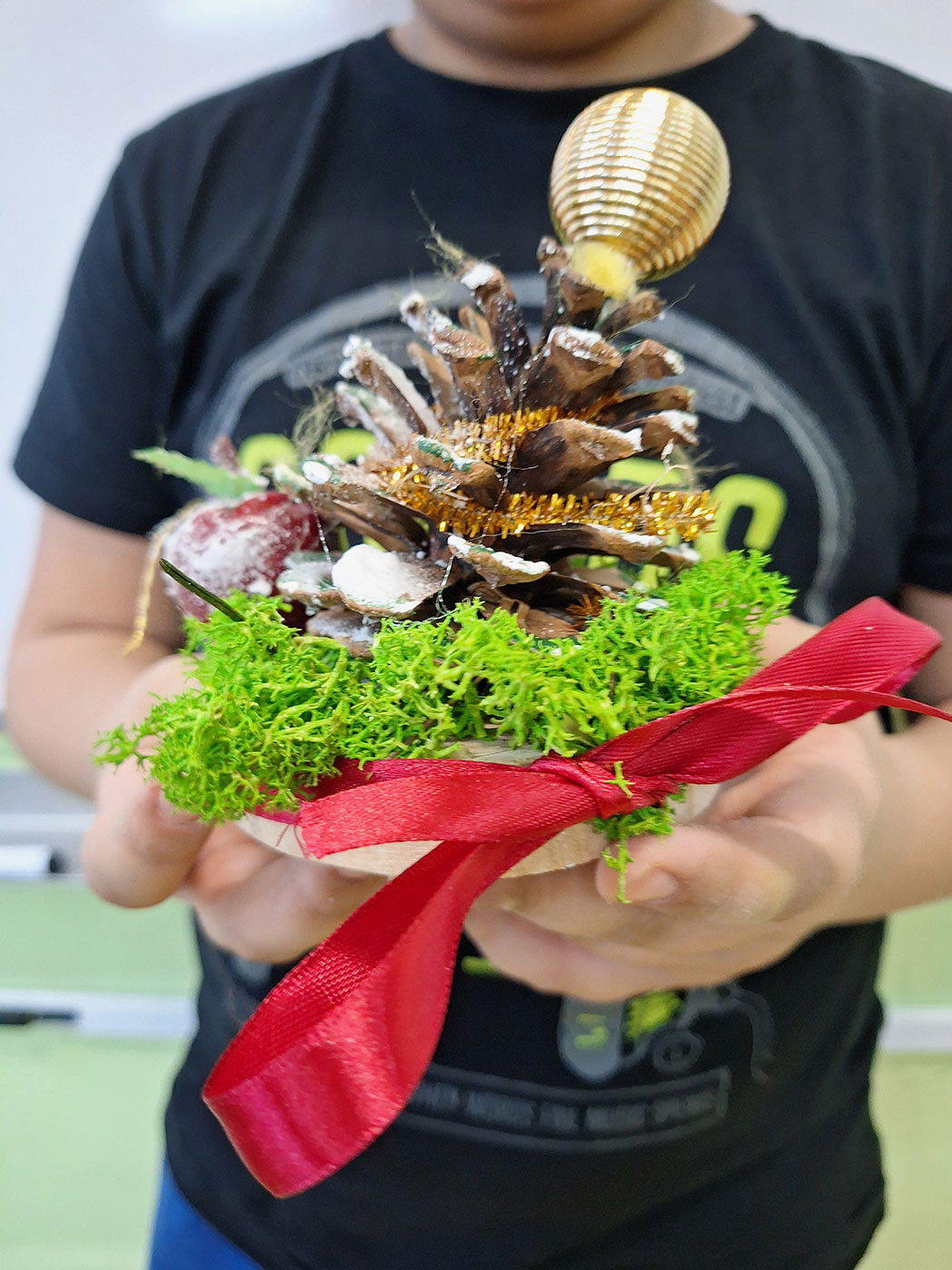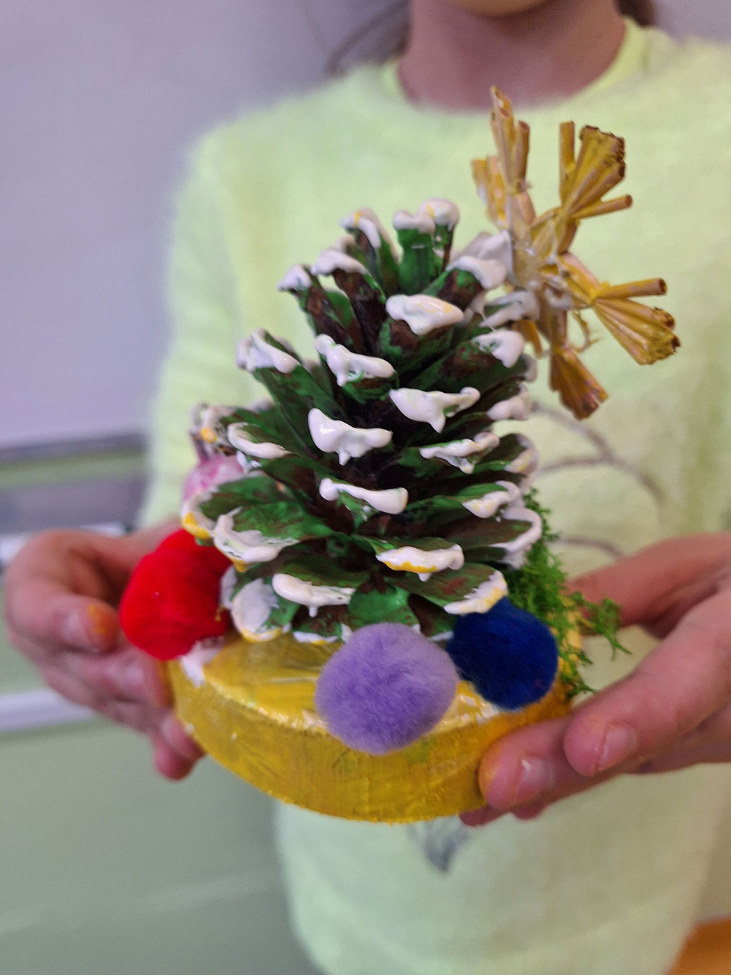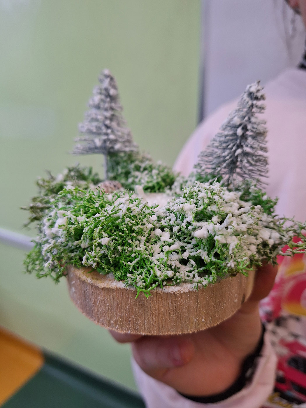 Podstawą ich prac były drewniane krążki, które stały się naturalnym i estetycznym podłożem do tworzenia świątecznych kompozycji. Dzieci z ogromnym zaangażowaniem i kreatywnością ozdabiały swoje stroiki gałązkami świerku, szyszkami, bombkami oraz kolorowymi wstążkami. Każda praca była niepowtarzalna i odzwierciedlała indywidualne pomysły uczniów, a w klasie zapanowała radosna, świąteczna atmosfera. Zajęcia stały się okazją do rozwijania zdolności manualnych, poznawania tradycji bożonarodzeniowych oraz wspólnej zabawy, która jeszcze bardziej zintegrowała uczniów. Powstałe stroiki wprowadziły do szkoły magię nadchodzących świąt i były pięknym dowodem na to, że własnoręcznie wykonane ozdoby mają szczególną wartość.