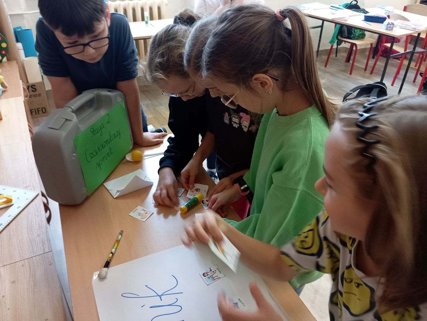 W ramach innowacji „Polski poza ławką” uczniowie klasy 3b uczestniczyli w niecodziennych zajęciach pt. „Gramatyczny tor przeszkód”. Podczas aktywnych stacji zadaniowych trzecioklasiści utrwalali znajomość części mowy, klasyfikowali wyrazy oraz rozwiązywali krótkie zadania językowe.