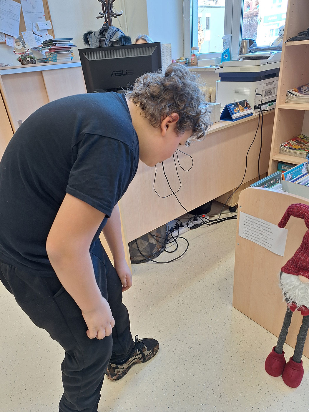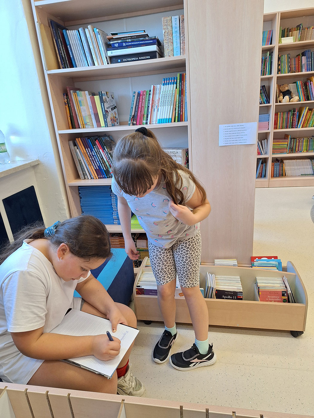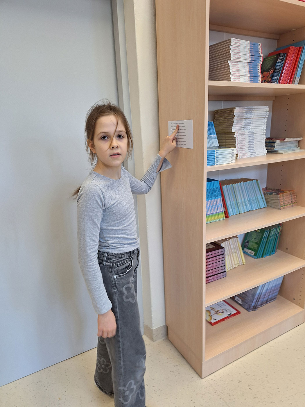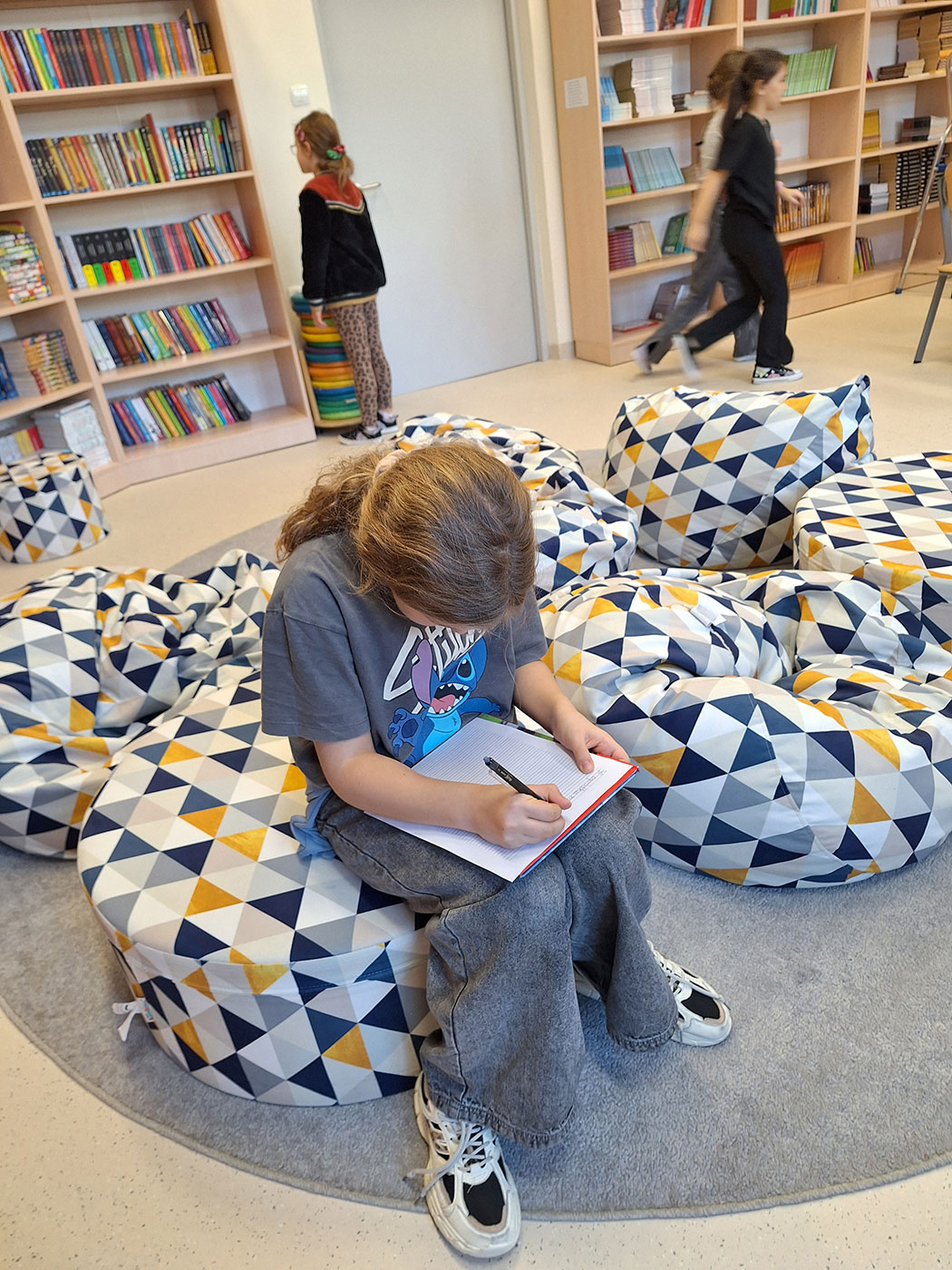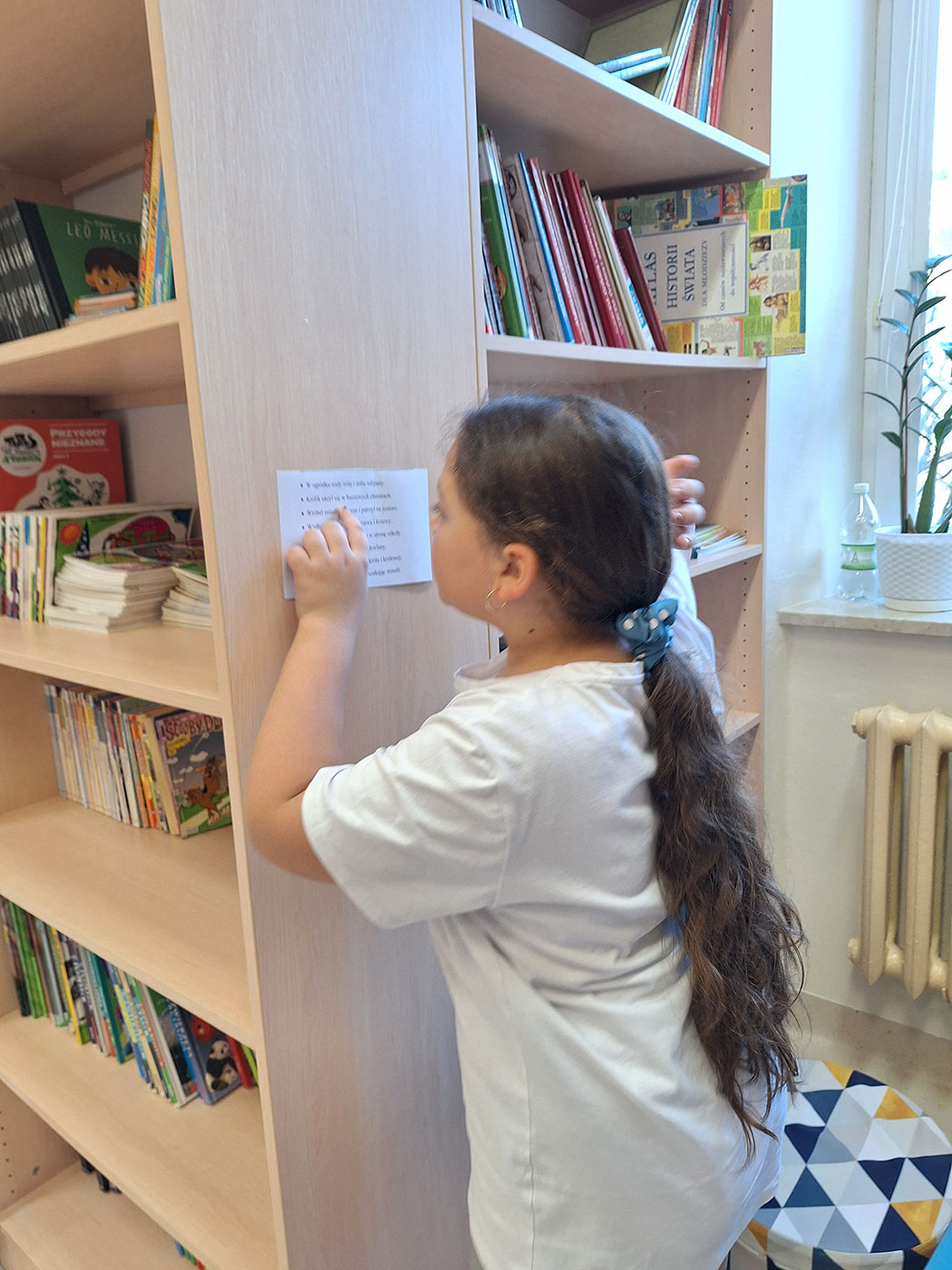 W ramach projektu „Polski poza ławką” uczniowie klasy 3a mieli okazję uczestniczyć w niezwykłej lekcji języka polskiego, która wyjątkowo odbyła się w szkolnej bibliotece. Zamiast tradycyjnego siedzenia w ławkach, dzieci wzięły udział w dyktandzie bieganym. Polega ono na tym, że zdania zawierające trudne wyrazy – w tym przypadku z „ó” i „rz” – zostały rozmieszczone w różnych miejscach sali. Jeden z uczniów w parze podbiegał do wywieszonego tekstu, zapamiętywał fragment i wracał, aby podyktować go swojemu partnerowi. Drugi uczeń zapisywał zdanie na kartce, starając się zachować poprawną pisownię.