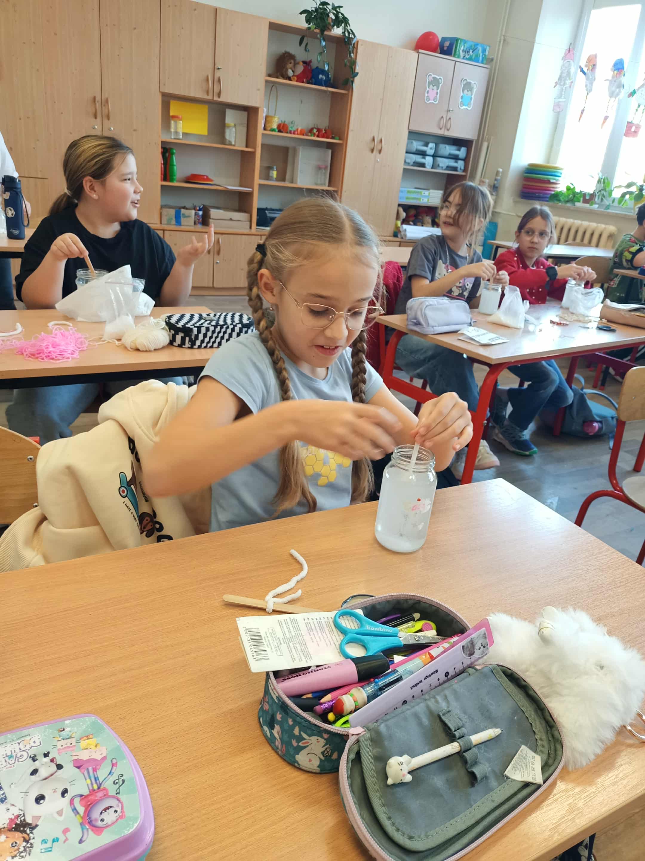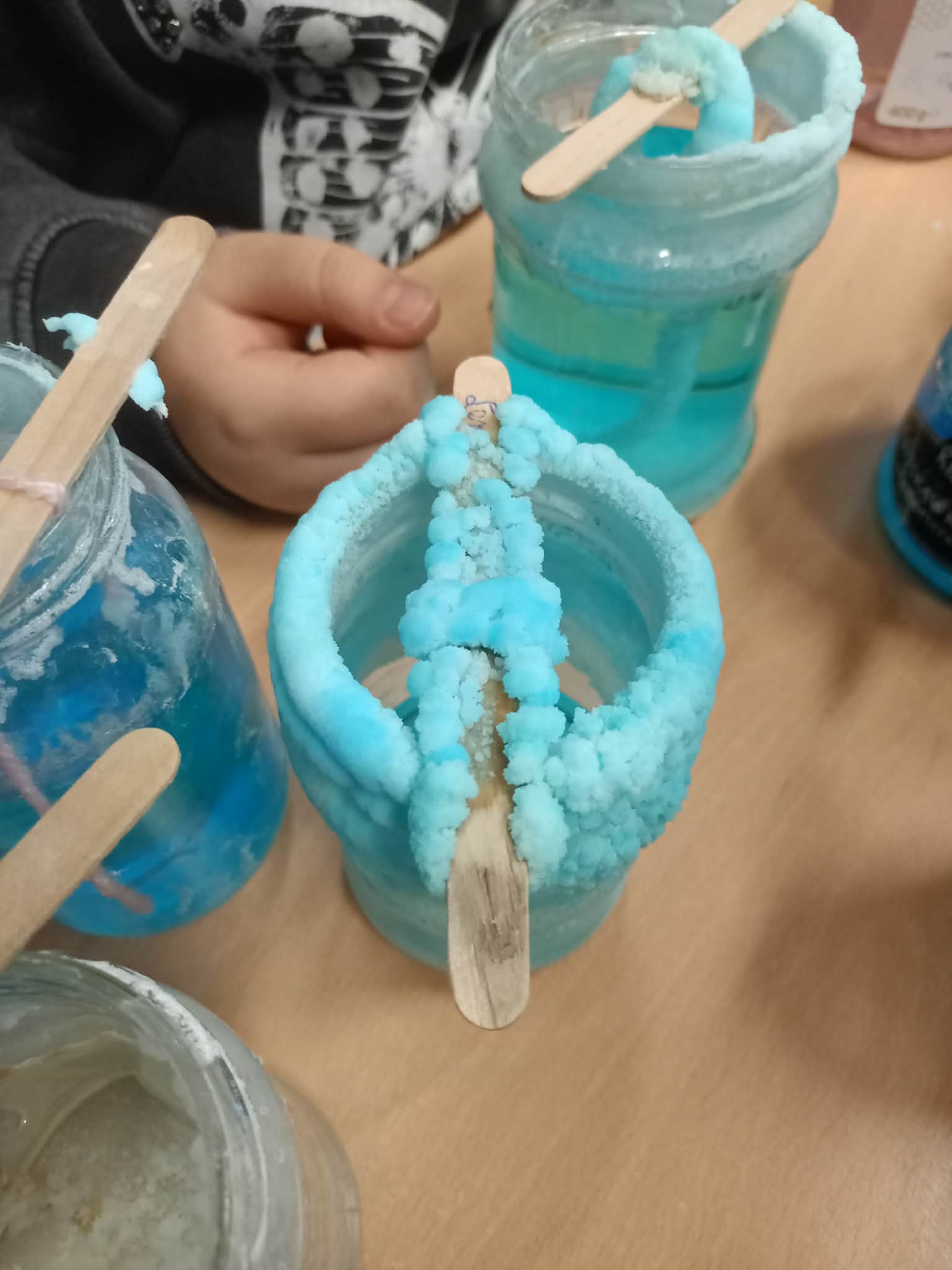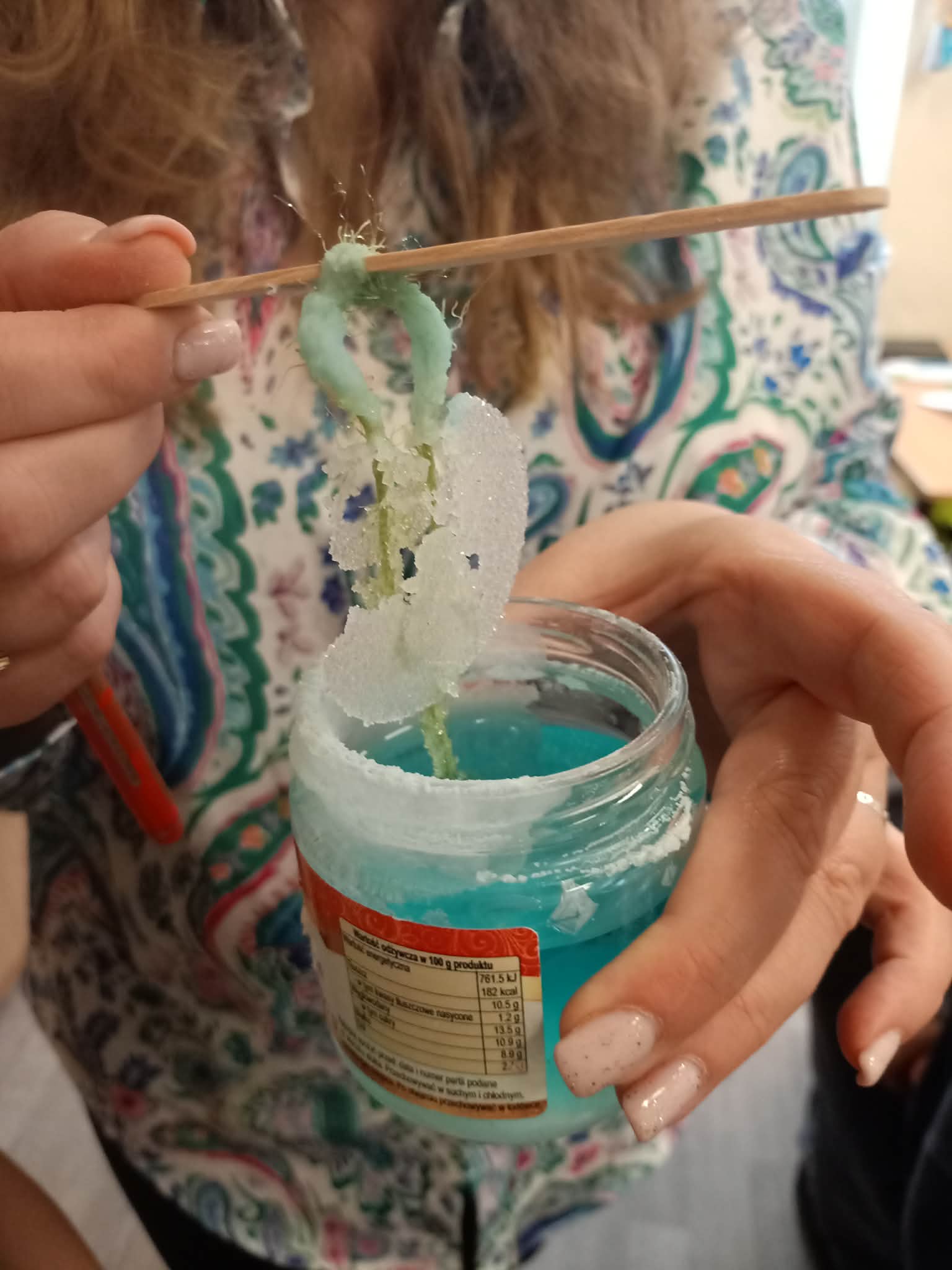 Przez kolejny tydzień uczniowie codziennie obserwowali, jak woda powoli odparowuje, a na nitkach zaczynają tworzyć się pierwsze kolorowe kryształki. Z każdym dniem stawały się one większe, wyraźniejsze i coraz intensywniej zabarwione. Dzieci zauważyły też, że różne kolory dają różne efekty i chętnie porównywały swoje słoiki.
