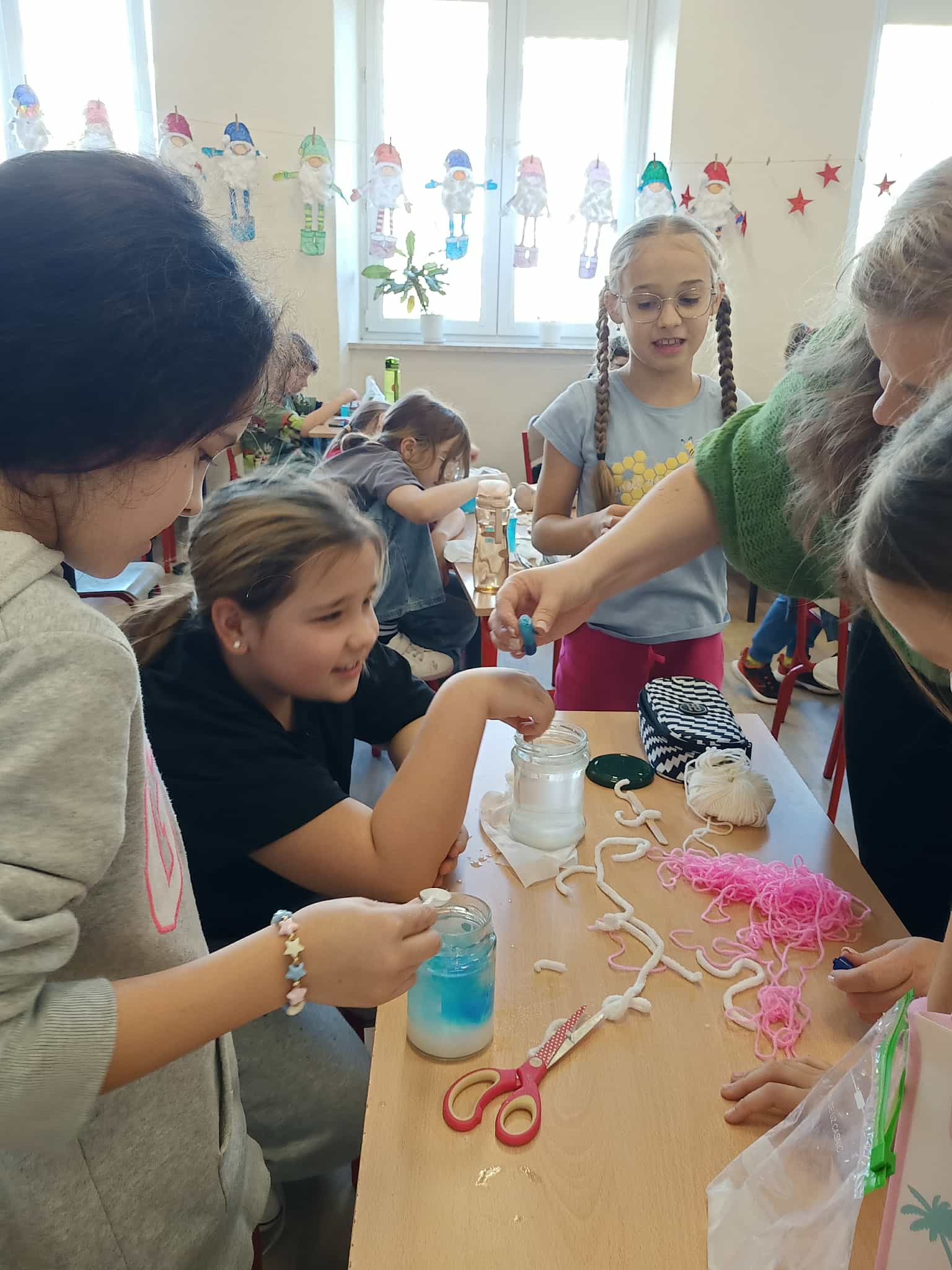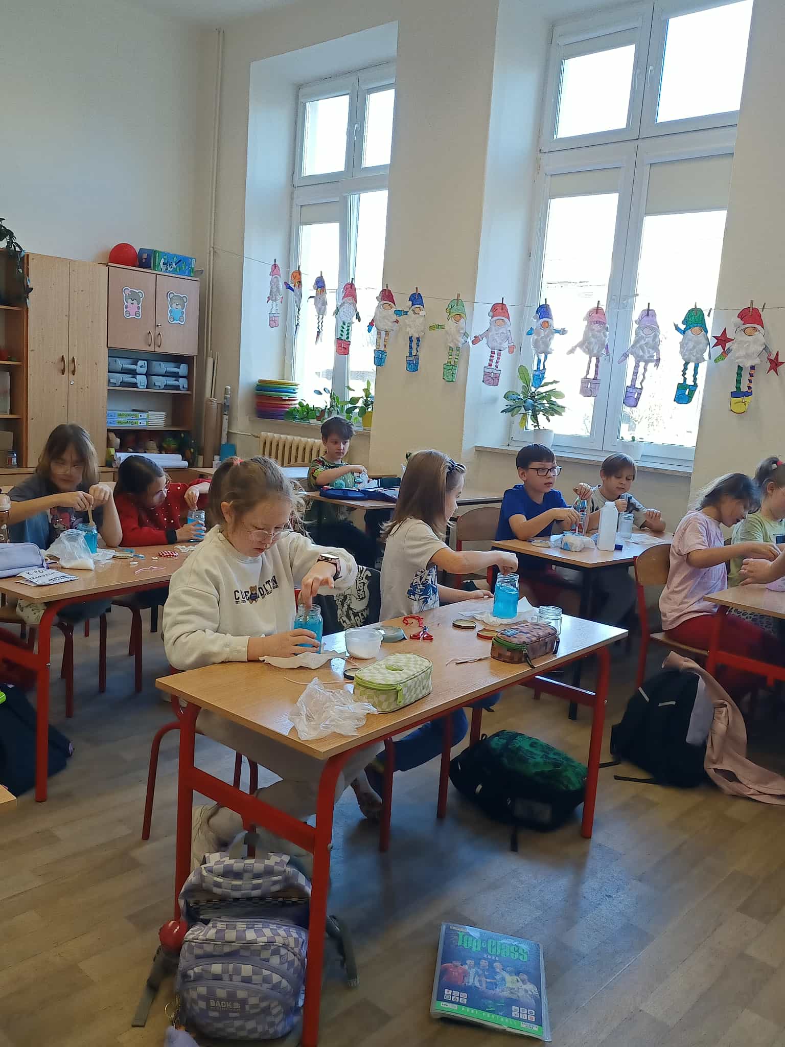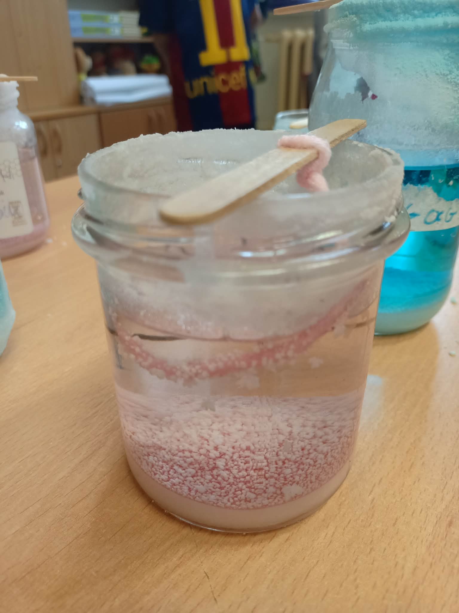 Przez kolejny tydzień uczniowie codziennie obserwowali, jak woda powoli odparowuje, a na nitkach zaczynają tworzyć się pierwsze kolorowe kryształki. Z każdym dniem stawały się one większe, wyraźniejsze i coraz intensywniej zabarwione. Dzieci zauważyły też, że różne kolory dają różne efekty i chętnie porównywały swoje słoiki.