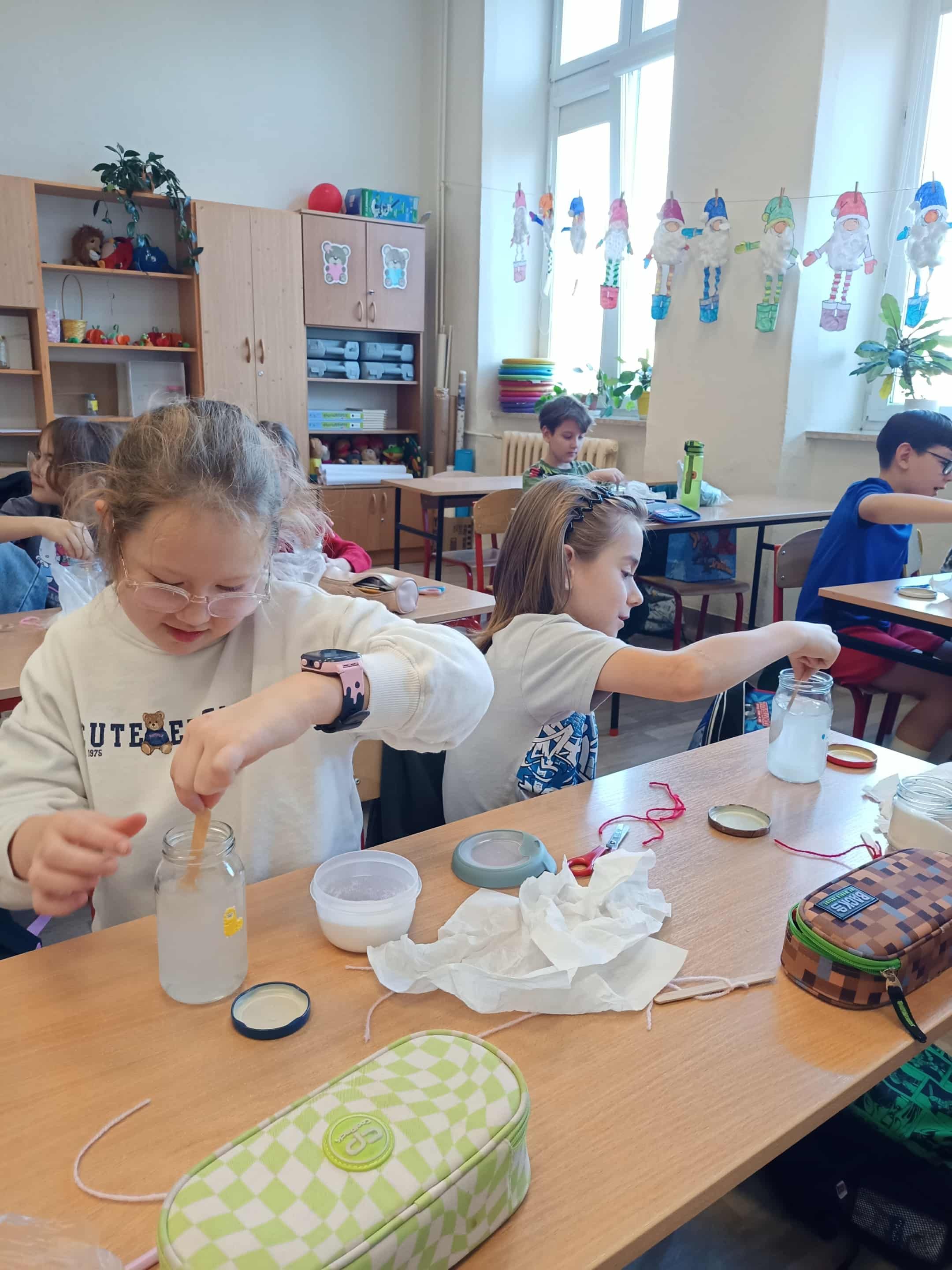 W klasie 3b przeprowadziliśmy doświadczenie polegające na założeniu hodowli kryształków soli. Na początku przygotowaliśmy nasycony roztwór soli, rozpuszczając ją w ciepłej wodzie aż do momentu, gdy przestała się rozpuszczać. Aby uzyskać ciekawszy efekt, do roztworu dodaliśmy barwniki spożywcze w różnych kolorach. Następnie roztwory przelaliśmy do słoików, a nad nimi zawiesiliśmy nitki na patyczkach od lodów.