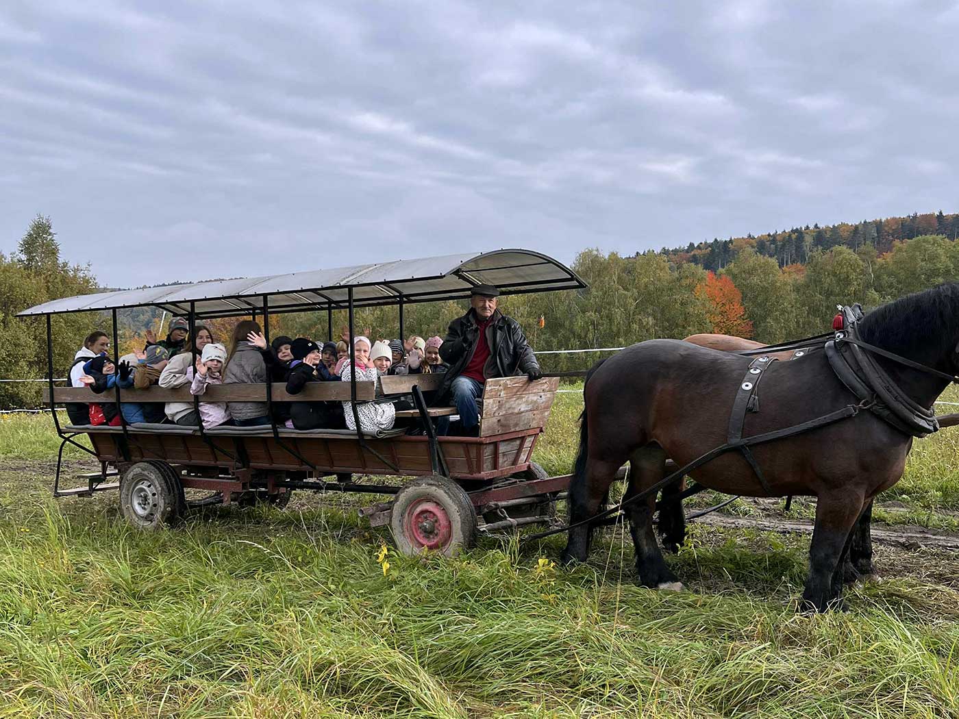 W czasie pobytu dzieci poznawały różne zwierzęta gospodarstwa domowego: kozy, owce, kury, króliki i konie. Kontakt ten dostarczył wielu niezapomnianych przeżyć, wzruszeń i radości. Największą popularnością cieszyło się karmienie kozy Klary i “przytulaski” z klaczą o imieniu Wega. Miłą niespodzianką okazała się także przejażdżka zaprzęgiem konnym (bryczką).